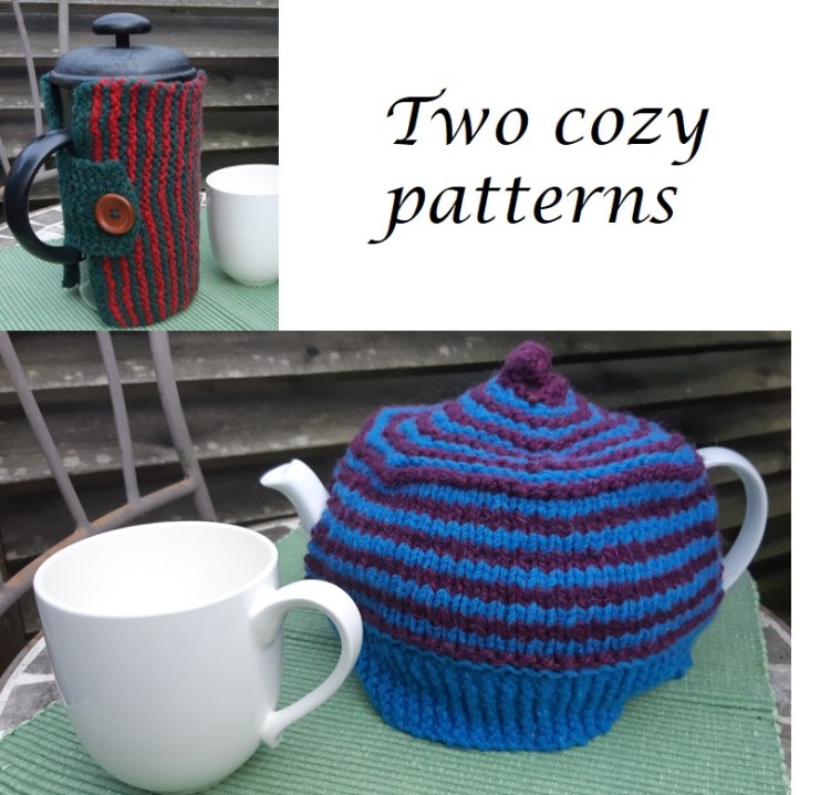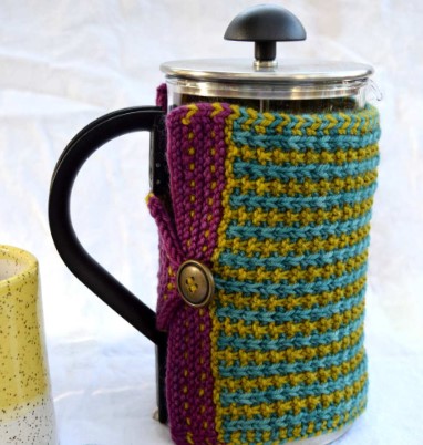 Coffee Cozy and Teapot Mat: Mosaic/slip stitch cozy for a French Press, using three colours of DK weight yarn. Pattern is one of a trio that includes a crochet version and a quilted version. Published by Digits & Threads (pdf link to description) in April 2023 for Studio Members/Subscribers.