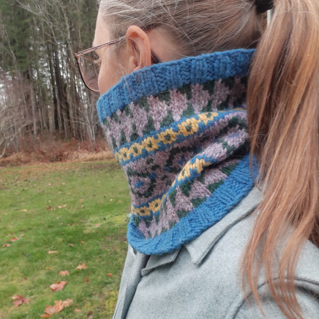 Which Way Cowl: Stranded colourwork cowl. Knits up quickly using four colours of heavy worsted/aran weight yarn. Available from Ravelry and Payhip.