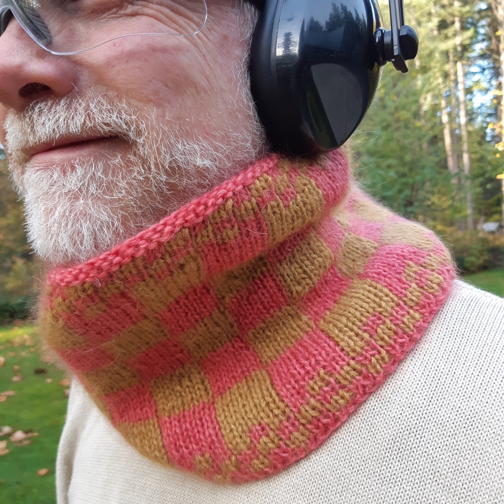 Double Draughts Cowl: A mellow introduction to double knitting. Checkerboard cowl worked in two contrasting fingering weight yarns held with mohair silk yarns. Available from Ravelry and Payhip.